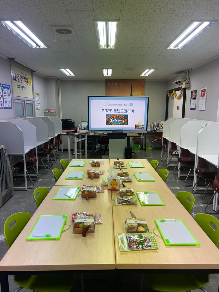 안녕하세요! 행복한 강쌤입니다 저희원은 정기적으로 부모님들과 대면하는 '교육콘서트'라는 행사를 하고있어요. 올해를 마무리하는 12월! 어제 학부모님들을 초대해 교육 콘서트를 열었어요. 엘리베이터안에 웰컴존도 만들었구요 수제 샌드위치랑 간식도 정성스럽게 준비하고, 퀴즈를 위한 작은 선물들도 넉넉히 챙겨 두었죠. 이번 콘서트는 ‘도전! 골든벨’ 콘셉트로 진행해서 모두가 함께 웃고 참여하는 즐거운 시간이 되었어요. 미니 칠판이 큰 도움됐지요. 어머님들의 반응도 정말 따뜻했고, 강의를 하는 내내 제 마음도 행복으로 가득했어요. 이번 콘서트는 '트렌드 코리아 2026'을 기반으로 구성해 보았고, 마지막에....... <img src="https://blogthumb.pstatic.net/MjAyNTEyMTlfMTcg/MDAxNzY2MTAyNjA4NzE2.V8LG1voMjkYBHDprWwP4hzFuwzGh5VFV33OBx69YmMsg.Vev_-z3MGWnBLowP13vdtfkAoLBUecawsoEMZCre-aUg.JPEG/IMG%A3%DF0384.JPG?type=s3" />
