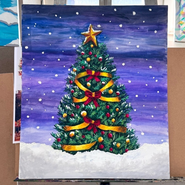 안녕하세요 그루아뜰리에입니다~! 오늘은 지난 포스팅에 이어 캔버스 작품 제작 모습을 보여드릴게요! 지난 겨울 캔버스 작품 그리는 기간동안 계절과 어울리는 크리스마스 트리로 주제를 정한 친구에요! 푸른색 배경을 먼저 채색한 뒤 나뭇잎의 질감을 살리며 초록색 부분을 채색했어요. 화려한 트리의 장식들과 하늘에 내리는 눈까지 표현하고~❄️ 짠! 이렇게나 멋진 크리스마스 트리 작품을 완성했답니다! 디테일이 많은 그림이라 실물로 보면 친구의 정성과 노력이 더욱 잘 느껴지는 그림이랍니다~ 이 작품은 5월에 있을 원내 전시에서 만나볼 수 있습니다! 그루아뜰리에에서는 아이의 연령과 성향에 맞추어 창의미....... <img src="https://blogthumb.pstatic.net/MjAyNjAzMjRfMTAy/MDAxNzc0MzU0NDM1Nzcy.f00KLYeVC79pA9Qgh-VpjI7gZ5rzfy3IqUSJEALGcosg.caYgOzZ93ZXvgg1nO5kGjZSJuGvod4jirsUMTC-071Yg.JPEG/output%A3%DF1117757070.jpg?type=s3" />