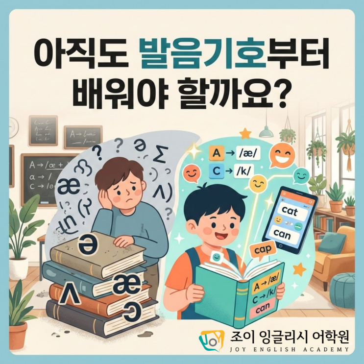"아직도 발음기호부터 배워야 할까요?" 변화하는 영어 학습 트렌드, 조이잉글리시가 답해드립니다! 학부모님들과 상담을 나누다 보면 가끔 이런 질문을 받곤 합니다. "요즘 학원들은 발음기호를 안 가르치나요?" "발음기호를 알아야 단어를 읽을 수 있는 것 아닌가요?" 과거에는 영어를 시작할 때 발음기호 암기가 필수 코스였죠. 하지만 최근 영어 교육의 흐름은 확실히 달라졌습니다. 왜 발음기호 우선 교육이 사라지고 있는지, 그 이유를 짚어볼까요? 예전 방식: 또 하나의 '암기 숙제'였던 발음기호 예전에는 [알파벳 → 발음기호 → 단어 암기] 순서로 영어를 배웠습니다. ə, æ, ʌ, ɔ... 아이들....... <img src="https://blogthumb.pstatic.net/MjAyNjAzMDhfNzgg/MDAxNzcyOTUzODE3NjY3.4O_Of-wSAHGEeRY0LW-ZnFkjgfpKi4paiT_h7PvrQnUg.Fln0N_I4OhTtxIJxprTmqIbFOL9H6lJ91upeMCgXGRMg.PNG/%C1%A6%B8%F1_%BE%F8%B4%C2_%B5%F0%C0%DA%C0%CE.png?type=s3" />