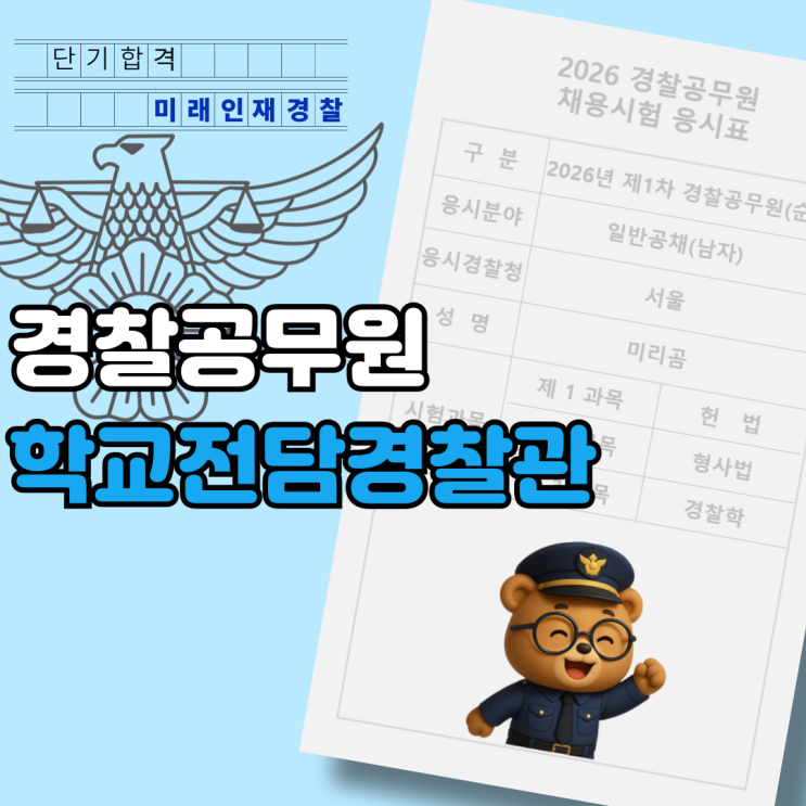 안녕하세요. 미래인재경찰학원입니다 여러분은 학생 아이들을 전담하는 경찰관이 있다는 사실, 알고 계신가요? 오늘은 우리 아이들의 안전한 학교생활을 위해 활동하고 있는 학교전담경찰관(SPO)에 대해 알아보겠습니다. 학교전담경찰관(SPO)이란? 학교전담경찰관(SPO, School Police Officer)은 사건 발생 후 출동하는 경찰이 아니라, 학교폭력 예방과 학생 보호를 위해 학교 현장에서 활동하는 전담 경찰관입니다. 학생들이 경찰을 “무서운 존재”가 아닌 “도움을 요청할 수 있는 어른”으로 느끼도록 하는 것이 핵심입니다. 학교전담경찰관의 주요 역할⭐ ①학교폭력 예방 활동 ✔️ 학교 주변 위험 요소 점검 ✔️ 학교폭력 예....... <img src="https://blogthumb.pstatic.net/MjAyNjAyMTlfOTEg/MDAxNzcxNDk1NDE0ODUx.Zzr2NkGJZB_1ClMKXZ-S4vjqebrlLvOpYT99FGScJZYg.wzzhfKlROtaBwlSlNcvG4HSexAieYxZ13K3F8WXEkv8g.PNG/%C8%B8%B5%B6-%C1%DF%BD%C9-%B0%E6%C2%FB%BD%C3%C7%E8-%C1%D8%BA%F1-%C0%FC%B7%AB-%C1%A4%B8%AE-002.png?type=s3" />