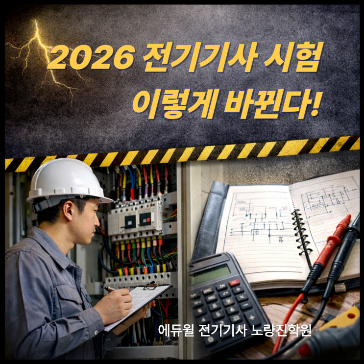 2026 전기기사 시험, 이렇게 바뀝니다 정책 변화 핵심 정리 & 합격 전략 분석 안녕하세요. 에듀윌 전기기사 노량진학원입니다 ⚡ 2026년 전기기사 시험을 준비하시는 분들이라면 “올해 달라진 점이 있을까?” “시험 난이도가 더 올라가는 건 아닐까?” 이런 궁금증을 많이 가지실 텐데요. 최근 발표된 국가기술자격 정책 변화와 전기기사 시험 출제 방향을 정리해드리겠습니다. 1️⃣ 국가기술자격시험 전면 개편 방향 (2026년) 2026년부터 국가기술자격시험은 산업 변화에 맞춘 실무 중심 평가 강화 방향으로 개편되고 있습니다. 특히 중요한 포인트는 다음과 같습니다. ✔ 실무 능력 중심 출제 강화 이론 암기형 문제보다 현장 적용....... <img src="https://blogthumb.pstatic.net/MjAyNjAyMjBfMjYz/MDAxNzcxNTg4NTQ0NTY1.mdKxjDKIoZQh5Ysunewx8I1y2FxUBlZrCF3gB7fFLHkg.GGgzLTBoMWuqlvYenzRohzOT6SmK-viBvrlGaIsrjWUg.PNG/%C0%FC%B1%E2%B1%E2%BB%E7.png?type=s3" />