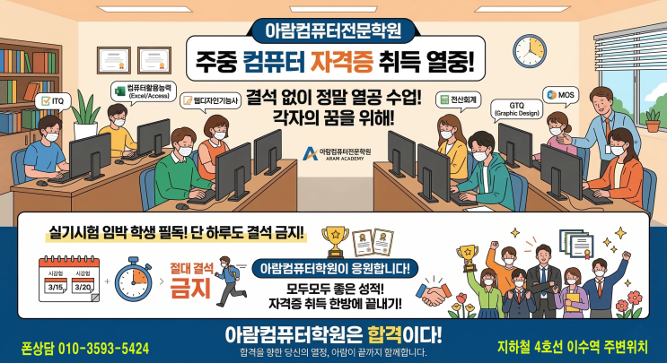 안녕하세요. 컴퓨터자격증다따네! 아람컴 아람돌이입니다. 3월 13일 금요일반 오늘도 컴퓨터 자격증 취득 위해 열공하는 학생들 그리고 컴퓨터 기초 OA 활용 과정 배우는 학생들 특성화고 학생들 중 SW 학과 보안학과 학생들이 주로 배우는 코딩 과정 오늘도 결석 없이 열공하는 아람 컴 학원생들 최고이십니다. 배우는 시간, 배우는 과정은 다르지만 다들 열정적으로 수업받고 있는 모습 보기 좋습니다. 곧 실기시험이 얼마 남지 않은 학생들은 절대로 결석하시면 안 됩니다. 주중에 결석 있던 학생들은 주말반(토) 오전 10시 부도 있으니 꼭 오셔 보충을 받으시길 바랍니다. 여러분들의 열정을 아람 컴퓨터학원이 옆에서 더 응원하겠습니다. 오....... <img src="https://blogthumb.pstatic.net/MjAyNjAzMTNfMTc3/MDAxNzczMzkyOTMxNDAx.adko2FL44SE_dA5hLZe3XunA2DTkqec9bajm6owzwOMg.msVh0azod5CfY9emQshQzcAAcqI4cRrL3qItJzJKwnAg.PNG/%BE%C6%B6%F7%C4%C4%C7%BB%C5%CD%C7%D0%BF%F8111.png?type=s3" />