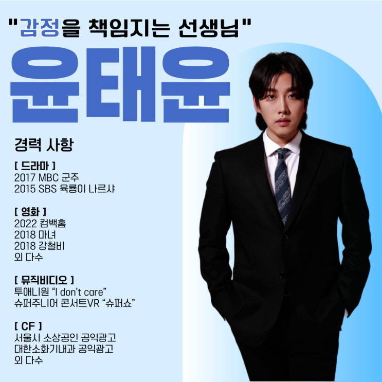 안녕하세요. 아역배우의 시작을 함께 하는 청소년연기학원 퍼스트액터스 입니다. 퍼스트액터스는 드라마부터 영화, 광고 등 다양한 분야로 아이들을 캐스팅 하고 있습니다. 오늘은 저희 퍼스트의 아역 연기 수업을 맡고 계신 윤태윤 선생님을 소개 합니다! 윤태윤 선생님 [퍼스트액터스의 윤태윤 선생님 경력사항] <드라마> 2017 MBC 드라마 군주 - 광대 역 2015 SBS 드라마 육룡이 나르샤 - 유생결사단 역 <영화> 2022 컴백홈 - 조직원 역 2018 마녀 - 최요원 역 2018 인랑 - 국정원 직원 역 2018 강철비 - 일본 국방부 장관 비서 역 2018 돈 - 펀드매니져 역 2010 내깡패같은애인 - 신입사원 역 2009 홍길동의 후예 - 웨이터 역 &l....... <img src="https://blogthumb.pstatic.net/MjAyNTEyMTdfMzIg/MDAxNzY1OTUzMjIzMzcx.7Kr2FwfeF_MerL8sq30CGGD8SWMVUOdyLJQ5W0KTpBEg.FMvBnQDuRpsTZDKE5LMsb6_VQjoM3pAfAAFkDa2tEgIg.PNG/020.png?type=s3" />