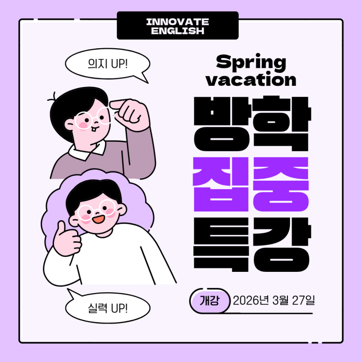 안녕하세요? 이노베이트 영어입니다. 이번년도 많은 부모님들과 학생들의 성원에 입어 봄방학 특강을 진행할 예정입니다! 국내* 해외학교 특별 특강 이번 봄에도 도전해 보세요! 자세한 문의는 하단의 카카오톡 채널이나 번호 02-555-1967로 전화주세요. NLCS Jeju - 3/28 - 4/12 YISS - 3/28 - 4/5 SIS - 3/28 - 4/5 SFS - 3/28 - 4/5 Chadwick - 3/28 - 4/5 KIS - 3/28 - 4/5 KFS - 3/28 - 4/5 Branksome - 4/4 - 4/11 SJA - 4/11 - 4/19 <img src="https://blogthumb.pstatic.net/MjAyNjAyMDlfMTMg/MDAxNzcwNjEyMjI3Mjc2.ryMi_438KQr7MkR7WH4eWcAuHWN4er0YthI_aYJO7tMg.8t7COOK74UvB4xJ3W-6jgvYQknfJYJWu3gAsyd1V7bkg.PNG/Spring_vacation.png?type=s3" />