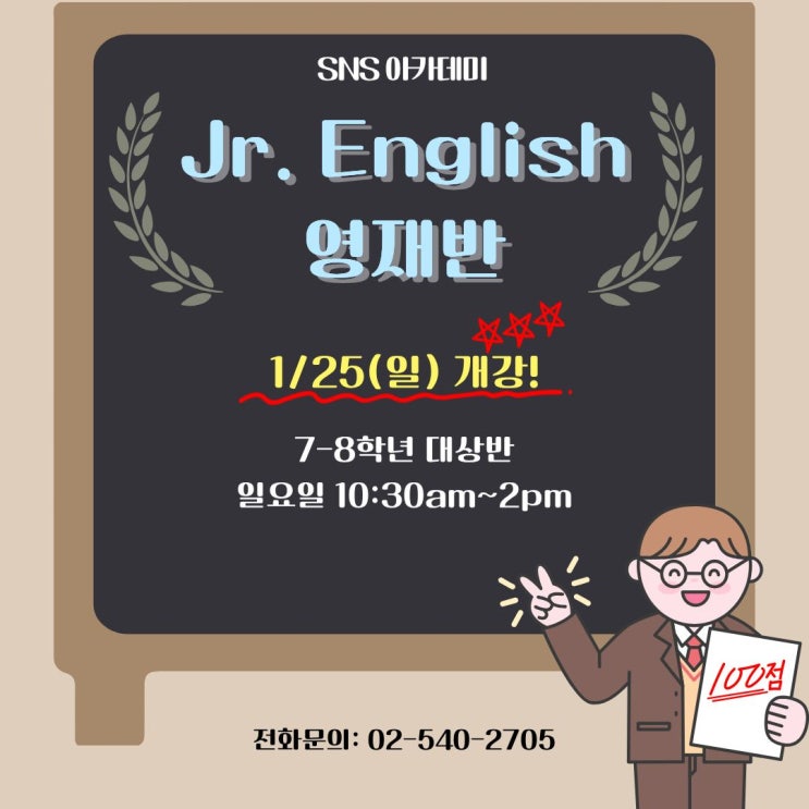 제대로 가르치고 제대로 배우는 2026 2학기 (1-5월) S&S Junior 영재 Program Junior English 신규반 1/25(일) ~ 5/31(일), 총 18회 일요일 10:30am-2pm 7,8학년 학생들을 위한 제대로! 배울 수 있는 영어수업을 S&S 에서 진행합니다. 고급영어로 가는 제일 중요한 단계인 7,8학년 이 때! 학생들에게 꼭 필요한 높은 퀄리티의 수업을 만나보시기 바랍니다. 보다 더 자세한 문의사항은 학원으로 전화주시기 바랍니다. S&S 아카데미: 02-540-2705 S&S 아카데미 위치 2026 SAT Program 2025 SAT 시험 결과 및 분석 2024 DSAT 결과 / 후기 <SNS Academy 카톡으로 문의....... <img src="https://blogthumb.pstatic.net/MjAyNjAxMTlfMjM1/MDAxNzY4ODA4NTk2MTU1.i93R_qW-0x3US-3W1uqdGlL3dBNUP-BRJSTFnj0y1Qcg.MxqFdQvyGEdsUMlNAEbAJO6ALnxibfdKgZyed4PI2Wog.JPEG/%C1%A6%B8%F1%C0%BB_%C0%D4%B7%C2%C7%D8%C1%D6%BC%BC%BF%E4._%281%29.jpg?type=s3" />