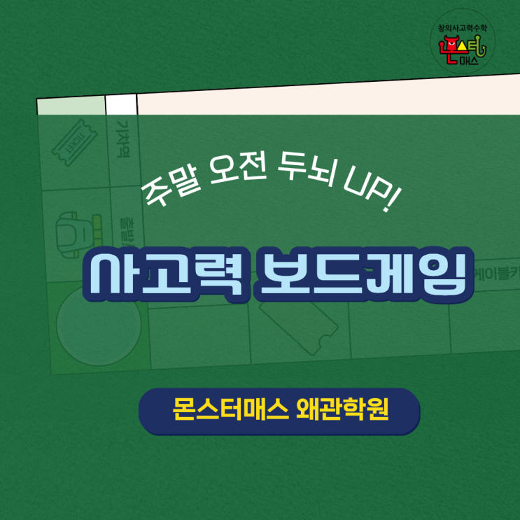 왜관보드게임 주말 보드게임 활동, 아이들에게 어떤 도움이 될까요? 안녕하세요. 몬스터매스 왜관학원입니다. 작년 6월부터 시작된 재원생 대상 주말 보드게임수업이 1월2월 잠시 휴식을 하고 3월부터 다시 시작하였습니다. 전체학생들에게 공지를 보내고 네이버예약을 통해 신청을 받고 지난 토요일 26년 첫 보드게임 수업을 하였습니다. 평일에는 학교와 학원 수업으로 바쁜 아이들에게 주말은 잠시 숨을 고르며 새로운 방식으로 배우는 시간이 되기도 합니다. 저희는 아이들이 부담 없이 즐기면서도 자연스럽게 성장할 수 있도록 보드게임 활동을 활용하고 있습니다. 보드게임은 단순한 놀이처럼 보일 수 있지만, 아이들에게는 생각보다 많은....... <img src="https://blogthumb.pstatic.net/MjAyNjAzMTVfNTMg/MDAxNzczNTYyMjU1MTcz.m_v0JsjizZfTQJx1F02zo65wJ0YLbzvEXVBMH4gyrIQg.aMYwfhVJ2QYkfeTLY1ITvG8GdoDJMneDkFK_Yd-GXzUg.PNG/1.png?type=s3" />