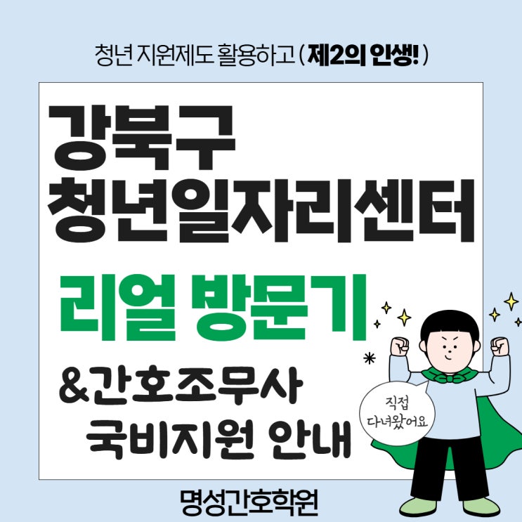 2월 졸업 후 수유역, 미아역 인근에서 취업을 고민 중인 청년분들 많으시죠? 혼자 준비하기 막막한 그 마음을 알기에, 명성간호학원이 직접 강북구 청년일자리센터에 다녀왔습니다! 쾌적한 시설 활용법부터 에릭슨의 심리학으로 풀어본 2030 추천 전문직, 간호조무사 활용 팁까지 알차게 담았으니 끝까지 확인해 보세요! 안녕하세요 '나의 명성을 위하는 특별함' 명성간호학원입니다. 수유역과 미아역 인근에 구직중인 청년들을 위해 저희 명성간호학원에서 직접 발로 뛰어봤어요! 강북구 청년일자리센터를 방문하게 된 이유는 요즘 근 1년 사이 저희 명성간호학원에 2030세대 수강생분들이 조금씩 늘고 계시는 추세인데 "진짜 취....... <img src="https://blogthumb.pstatic.net/MjAyNjA0MjlfNTMg/MDAxNzc3NDMzMDI5NjY2._x1eci3YuEmeEqfWco4tdMfP7LsTd_o19yDLBPaU1Fgg.2n2nHOsi2UXSE2BoV0dz23ibj7N-LahFDg9KJ3kMMMMg.JPEG/%B0%AD%BA%CF%B1%B8%C3%BB%B3%E2%C0%CF%C0%DA%B8%AE%BC%BE%C5%CD-%B9%E6%B9%AE%B1%E2-%B0%A3%C8%A3%C1%B6%B9%AB%BB%E7-%B1%B9%BA%F1%C1%F6%BF%F8_2.jpg?type=s3" />