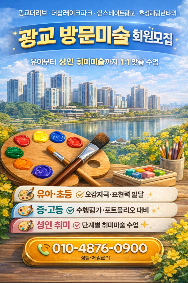 광교 방문미술이 필요한 이유 광교 지역은 다음과 같은 특징이 있습니다. 학군 중심의 교육환경 초등부터 중등까지 학업 경쟁이 높은 지역 창의력 교육과 비교과 활동 중요성 증가 미술은 단순한 그림 수업이 아니라 창의력 관찰력 표현력 자기주도 학습 을 키워주는 중요한 교육입니다. 특히 중학생 미술 내신에서도 기본기가 중요하기 때문에 어릴 때부터 체계적인 미술교육이 필요합니다. 광교중앙역 방문미술 수업 특징 방문미술은 전문 미술 선생님이 직접 집으로 방문하여 수업을 진행합니다. 1. 1:1 맞춤 미술수업 아이의 성향과 수준을 파악하여 맞춤형 수업을 진행합니다. 그림을 처음 시작하는 아이 미술을 좋아하는 아이 자신감이 부....... <img src="https://blogthumb.pstatic.net/MjAyNjAzMTFfMjIz/MDAxNzczMjM5ODMzMDgy.twQOowDYTPK5fTgWZmRsShbOGPCgF0mS1F3sIu5uqu0g.lK30hS5dJflgOn7__UjF_IvxgxCYWb4NXZx4RoJmP4gg.PNG/%B1%A4%B1%B3%B5%BF%C8%B8%BF%F8.png?type=s3" />