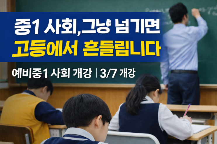 ! 2028 대입개편 대비 중1 사회, 지금 시작해야 합니다! “중학교 가면 사회가 많이 어렵다던데요…” “아직 시험도 없는데 지금부터 해야 하나요?” 네, 바로 지금이 시작할 타이밍입니다. 중1 사회는 고등 통합사회의 기초가 되는 출발점입니다. 첫 단추를 잘 꿰어야 보배가 되듯이, 기초를 잘 닦아야 성패가 결정됩니다. 왜 중1 때 시작해야 할까요? 중학교 1학년 때 개념 구조를 제대로 잡지 않으면 고등학교에서 처음부터 다시 해야됩니다. ※ 한번에 할 수 있는걸 2번을 해야된다. 2028 대입개편 이후 ✔ 통합형 사고력 강화 ✔ 내신 영향력 확대 ✔ 암기식 문제 감소, 이해 중심 평가 증가 사회는 이제 외우는 과목이 아니....... <img src="https://blogthumb.pstatic.net/MjAyNjAyMjBfMTMz/MDAxNzcxNTc1MjAzMzEy.qFeEbYC8_POr2giy3UjHVvArHJcBB2dYWHwTEEpuRx0g.kvhBbiwTcRMcqAQ3UJ1jhlu1P5Qw7ZIqCW0EQrK_dvgg.PNG/ChatGPT_Image_2026%B3%E2_2%BF%F9_20%C0%CF_%BF%C0%C8%C4_05_13_11.png?type=s3" />