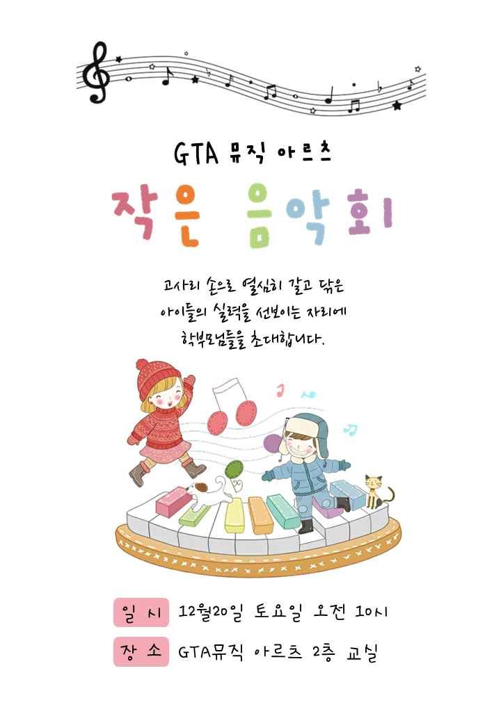 작은 음악회 공연을 위해 팜플렛,PPT도 만들고 토욜마다 리허설 연습도 하고 이제는 아이들이 실력 발휘 잘 하기를 간절히 바랄 뿐. 얘들아 잘 부탁한다.^^ 아이들보다 더 걱정하고 애를 태웠던 연습 시간들. 평소보다 화를 더 많이 내어 미안하기도 했지만 얘들아, 샘도 어쩔 수 없었단다.ㅜㅜ 너희들 모습을 사진으로 보니 진짜 열심히 연습했네 음악회때 제대로 실력 발휘 부탁해~^^ <img src="https://blogthumb.pstatic.net/MjAyNTEyMjFfMTgy/MDAxNzY2MjgwMjM3NzE2.53r5pT7-WheORKsHweL3znntZln_hkWmgPc5bdUsep0g.5VHa8F1Zh9Wd0VrvuXUUDpB-QIJ8fXtETFSJC5vIkM4g.PNG/1765432659762.png?type=s3" />