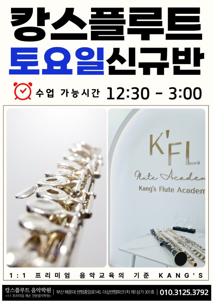캉스플루트 토요일 추가시간 OPEN ✨️토요일 플룻 추가 시간 class 수업 가능 시간: 12:30 ~ 3:00 선착순 6명만 추가 모집합니다 (1:1 개인레슨) 토요일 시간을 활용해 기초부터 차근차근, 전문적인 1:1 프리미엄 음악교육으로 시작해 보세요. 문의 및 상담은 DM 또는 학원으로 편하게 주세요 플룻 뿐만 아니라~ 플룻 전공자에게 배우는 리코더.단소도 수업 가능합니다~* 센텀캉스플루트음악학원 ✅️상담 010.3125.3792 #플루트는_캉스플루트 #클라리넷도 역시! 캉스플루트 #유치 부터 성인까지_only Kang's_1:1바이올린 #1:1 프리미엄 음악교육 <img src="https://blogthumb.pstatic.net/MjAyNjAyMDVfODgg/MDAxNzcwMjY0ODYyOTIz.Bqj79lScubW09ssPJFcAm05EZJ6OFK3f6NC4oWTUgpYg.V5Nzrf16aGmRt59BI_xY4ViEW5_Z_8SGwLT3uPpyPW0g.JPEG/900%A3%DF1770264074142.jpg?type=s3" />