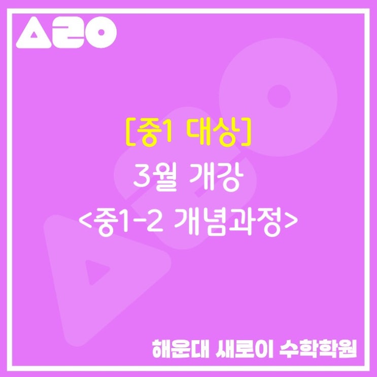 안녕하세요. 해운대 새로이수학학원입니다. 중1 대상 3월 개강 예정 중1-2 개념반 신입생을 모집합니다. ☞ 현재 중1-1 좌표평면과 그래프 단원까지 진행 중 ※ 2월 중 합류를 원하시는 경우 학원으로 별도 상담 부탁드립니다. <중1 대상> 과정 : 중1-2 개념반 개강일 : 3월 2일(화) 교재 : 개념플러스유형 라이트 ⏰3월 수업 요일 및 시간 화 · 목 (토) 오후 3:30 (오전 10:30) ※ 2월 토요일 수업 시간은 오후 3:00입니다. 수업 진행 방식 ✔ 학년 · 진도 · 수준별 정규반 구성 ✔ 소수정예 판서식 수업으로 집중도 향상 ✔ 판서형 개념 설명 + 대표 유형 풀이 ✔ 과제 및 부교재 공통 질문 → 판서 설명 ✔ 개별 질문 → 첨삭 지도 ☞ 전....... <img src="https://blogthumb.pstatic.net/MjAyNjAyMDhfMTQg/MDAxNzcwNTMwNzY4OTQ5.fKLYCMrE-9ttcOIS3yOplzws_EAtteHrwkP8AYdvUMAg.KYBGV7pQJ2fdbkyl6zIhYOWfoWQ1TKNgHmUsfI6YovIg.JPEG/%C1%DF1-2%B0%B3%B3%E4%B9%DD.jpg?type=s3" />