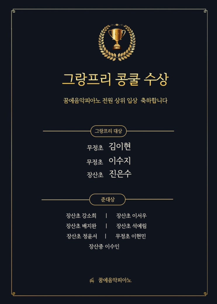 반여동 꿈에음악피아노 올겨울 콩쿨도 참여했는데요 그결과 , 올해도 대성공적 ☺️❤️ 3개월 동안 하루도 빠짐없이 1시간 이상씩 꾸준히 연습했고, 주말에도 학원에 나와 연습 힘들고 지칠 법한 시간들이었지만 포기하지 않고 끝까지 해내는 모습에서 아이들의 책임감과 성장을 크게 느낄 수 있었습니다 이렇게 쌓인 시간과 노력이 있었기에 무대 위에서의 연주가 더욱 빛날 수 있었던 것 같습니다 ✨ 전원 상위 입상 축하해 ❤️ 다들 다음콩쿨 또나가겠다며 벌써부터 준비 콩쿨이 남기는 것 콩쿨은 상으로 끝나는 경험이 아니라 아이들에게 큰 자신감을 남겨줍니다. ✔️ 어려운 곡을 완성했다는 성취감 ✔️ 무대 경험 ✔️....... <img src="https://blogthumb.pstatic.net/MjAyNjAyMDhfMyAg/MDAxNzcwNTQwODIyMDcx.JumwRfA4hiohAZyV16W0nbgaiK_MxSIEGnGVUReGRMQg.BfXXHwHHkFT1PUb6Bzd6cnfPa9QQaGEoNhuiNSuf0ZQg.JPEG/output%A3%DF1624039254.jpg?type=s3" />
