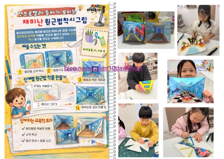 <원근법 착시 입체 그림 수업> 앞으로 튀어나왔는데, 안으로 들어가 보이는 그림 이번 수업은 원근법을 이용한 입체 착시 그림 활동입니다. 평면 종이에 공간을 그리고, 자르고 접어 입체 구조를 만들지만 완성된 작품은 오히려 안쪽으로 깊게 들어가 보이는 시각 착시를 만들어냅니다. 아이들은 이 과정을 통해 “눈으로 보이는 것”과 “실제 형태”가 다를 수 있다는 것을 그림으로 직접 경험하게 됩니다. 원근법 착시 입체 그림 수업은 아이들이 보고, 그리고, 만들고, 다시 생각하는 과정을 모두 경험할 수 있는 수업입니다. 그림이 단순한 표현을 넘어 생각을 바꾸고 시각을 확장하는 도구가 될 수 있다는 것을 아이들 스스로 느끼게....... <img src="https://blogthumb.pstatic.net/MjAyNjAyMDlfMTQy/MDAxNzcwNjQ0MDM3OTU5.ySybYaWy6_i4DyHztrTtvB8lP9VVFfa4aE5eIpkDKJkg.W9B4yqCYv2P0V0kAYm33YQD-J1Qi28NMSFXS3eZkd0Yg.JPEG/output%A3%DF3084855224.jpg?type=s3" />