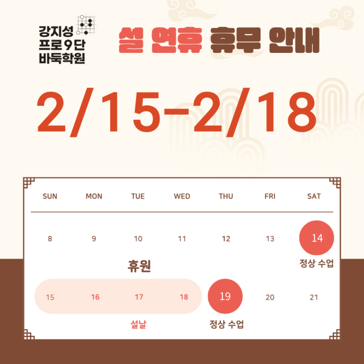 해운대바둑 강지성프로9단바둑학원 설날 휴원 안내