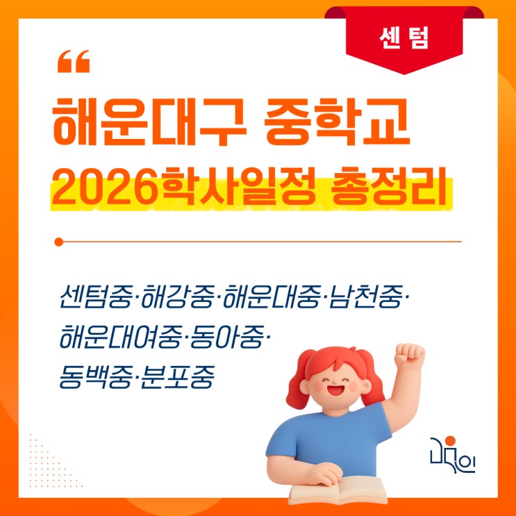 2026년 1학기 중간고사 중등 · 고등 내신대비 전략 부산 해운대 중학교별 2026년 학사일정 총정리 센텀중·해강중·해운대중·해운대여중·동아중·동백중·남천중·분포중 시험·방학 일정 한눈에 확인 시험 준비, 아직 시작 안 하셨다면 기준이 늦어진 겁니다 해운대 지역에서 학습 상담을 진행하다 보면 공통적으로 나오는 반응이 있습니다. “시험 기간 나오면 그때 맞춰서 준비하면 되는 거 아닌가요?”라는 질문입니다. 이 질문 자체가 틀린 것은 아니지만, 실제 학습 결과를 기준으로 보면 이 판단이 성적 차이를 만드는 출발점이 되는 경우가 많습니다. 시험은 단순히 날짜에 맞춰 준비하는 것이 아니라 준비 시작 시점과 분배 방식에 따라 결과....... <img src="https://blogthumb.pstatic.net/MjAyNjAzMjFfMTU5/MDAxNzc0MDcwOTA3MDY5.vS3xUBtSqf40imTuQ5yXe0H-itJiFO0U60zb2o7NQ54g.qxagDaHtBsNv82kZjEA0CLauxfwcc-RM6ctKrVUhvKIg.JPEG/%C7%D8%BF%EE%B4%EB%B1%B8_%C1%DF%C7%D0%B1%B3%BA%B0_%C7%D0%BB%E7%C0%CF%C1%A4-001_%281%29.jpg?type=s3" />