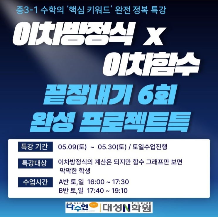 "고등 수학의 승패는 여기서 갈린다!" "중학 수학에서 가장 중요한 한 달, 이차방정식과 함수의 완벽한 연결 고리를 완성합니다." 공식 암기 NO! 이차방정식의 해와 함수 그래프의 교점, 그 원리를 꿰뚫는 강의. 고등 수학(상)으로 이어지는 핵심 개념 미리 보기 상담문의 0515830077 <img src="https://blogthumb.pstatic.net/MjAyNjA0MjlfMTM0/MDAxNzc3NDU5MzIyODIw.pZpYIIqRidDgUS3TAnyl1L648onmLyR2PWORkTSUgykg.yCg0zYP7T6Ttfok9t6mSJc6nvx00WVZkTBcbe7ClS0Ug.JPEG/%C1%DF3%C6%AF%B0%AD.jpg?type=s3" />