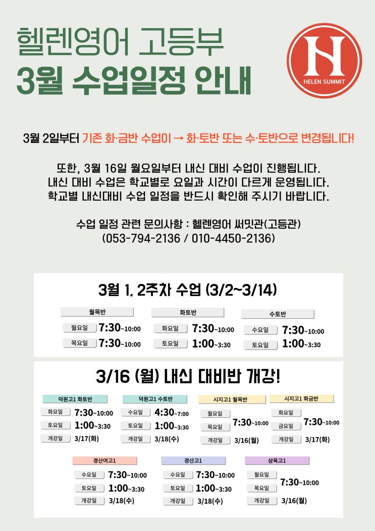 헬렌영어 써밋관 3월 일정 변동사항 및 내신대비 수업 안내