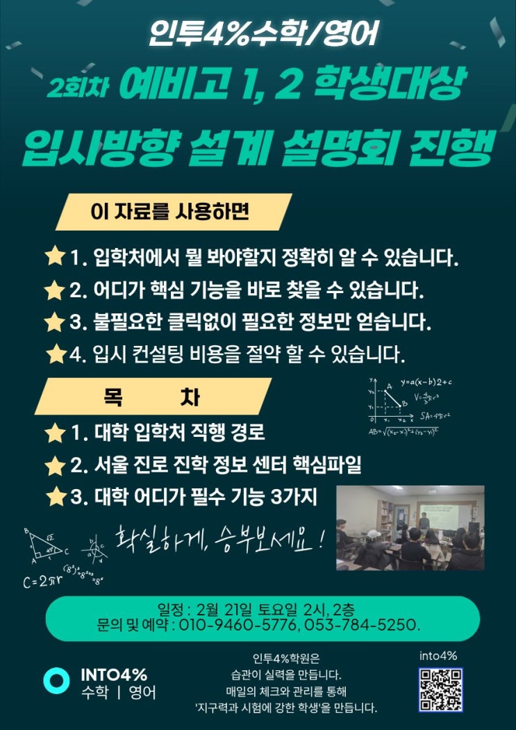 안녕하세요. 인투4% 수학·영어입니다. 1차 설명회 이후 많은 관심과 문의를 주셔서 2회차 예비고1·2 입시방향 설계 설명회를 추가로 진행하게 되었습니다. 고등 입시는 공부를 많이 하는 것보다 어디를 보고 준비하느냐가 훨씬 중요합니다. 이번 설명회는 막연한 입시 정보가 아니라 실제 활용 가능한 자료 중심으로 진행됩니다. 이 자료를 사용하면 달라지는 점 설명회에서 제공되는 자료를 통해 입시 준비의 기준을 명확하게 잡을 수 있습니다. ✔ 입학처에서 실제로 무엇을 봐야 하는지 정확히 알 수 있습니다. ✔ 어디에 핵심 기능이 있는지 바로 찾을 수 있습니다. ✔ 불필요한 검색 없이 필요한 정보만 확인할 수 있습니다. ✔ 별도의....... <img src="https://blogthumb.pstatic.net/MjAyNjAyMjFfMTMy/MDAxNzcxNjQ0MDEzMjI1.LOdKji2nFTjWtNVGktrviHd8bwMzpy4LZLjK6nsO4FQg.Dd4sOsxD2Jv1atNhj2NZj3XsQz-AcW5_JLN3cy-7CHsg.JPEG/KakaoTalk_20260220_191257203.jpg?type=s3" />