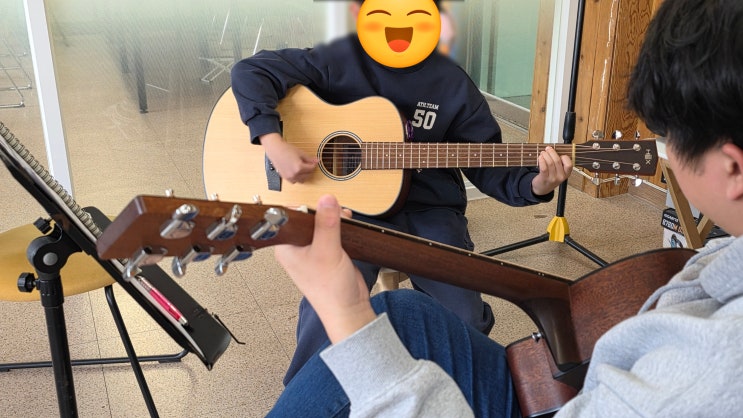 안녕하세요 :) 기타는 보통 중학생이나 성인부터 시작한다고 생각하시는분들이 많습니다! 사실 어린친구들도 충분히 재미있게 배울 수 있는 악기가 통기타 예요~ 이번에 수업을 하는 친구도 처음에는 기타를 조금 낯설어 했지만 기타를 잡는 방법부터 차근차근 알려주니 금방 적응하는 모습을 보여주었습니다!! 작은 손으로 열심히 코드를 잡아보며 소리를 내는 모습이 정말 귀엽고 열심히 하는 모습이 기억에 남아요 :) 어린친구들의 경우에는 어려운 이론보다는 리듬과 재미를 느끼는 것을 중심으로 수업을 진행하고 있습니다! 그래서 자연스럽게 기타에 대한 흥미를 느끼며 "기타 치는게 재미있다!" 라는 경험을 먼저 만들어주는 것....... <img src="https://blogthumb.pstatic.net/MjAyNjAzMDlfMTU0/MDAxNzczMDM0MjI5NTYx.pt2GQ4J-VSM0bOmZaGgaps-CAGYq8maip5JTujhsnV8g.Mw_R1J3NeOpZixxns7NwvATSRKQZUiAPfCB6EOFe50Eg.JPEG/KakaoTalk_20260309_141436638_07.jpg?type=s3" />
