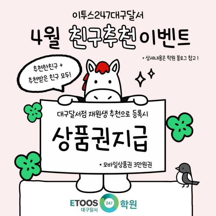 안녕하세요 이투스247대구달서점 입니다. 날씨도 솔솔 풀려가는 봄날~ 봄맞이 친구추천 이벤트를 시작합니다! 3/23~ 4/30까지 진행될 예정이며, 재수정규반 최초등록일경우 해당됩니다. ex) 윈터,썸머 했던 학생이 재수정규반 등록시 OK! 재수반 퇴원후 추천받고 재등원 X 재수반 이전 다닌 이력 있는경우 X 재원생은 친구 추천하여 상품권 받고 친구는 추천받아 등록하고 상품권받고! 상담/문의는 학원으로! <img src="https://blogthumb.pstatic.net/MjAyNjAzMjBfMjMz/MDAxNzczOTgwMjg2MDE5.FGg8qmFX3mbupfzSUetgcthrP4dBYQVZPkKDYfyPMYMg.l4TvDsHn9k21fVEee52agpowNFyN5JnrIdfqFUIRn6Ig.JPEG/4%BF%F9%C4%A3%C3%DF%C0%CC%BA%A5%C6%AE.jpg?type=s3" />
