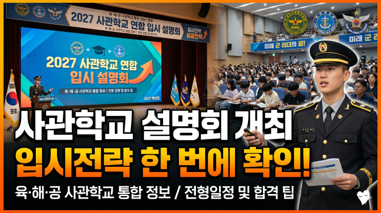사관학교진학설명회 소식이 나왔어요. 사관학교를 목표로 하는 학생과 학부모라면 이번 일정은 그냥 지나치기보다 꼭 한 번 체크해보는 게 좋겠습니다. 오는 4월 18일, 대전진로융합교육원에서 육·해·공 계열 5개 학교가 함께 참여하는 연합 설명회가 열린다고 해요. 무엇보다 별도 신청 없이 현장 접수로 참여할 수 있다는 점이 눈에 띕니다. 사관학교 입시는 관심은 있어도 어디서부터 준비해야 할지 막막한 경우가 많아요. 그래서 이번 사관학교진학설명회는 단순한 행사 소식이 아니라, 입시 방향을 실제로 잡아볼 수 있는 기회라는 점에서 의미가 큽니다. 학교 소개보다 더 중요한 건 전형 비교입니다 이번 설명회에서 가장 주목할 부분은 학....... <img src="https://blogthumb.pstatic.net/MjAyNjA0MTRfMjY3/MDAxNzc2MTUzMDg4NjE0.5O64PAICbjUgYx-Zcy4PHtuVWusyxrgcFH0-gLOBUeMg.00RoKoy7tYp79wHg1DegttvDL6eMuQb2HP0llPqCRusg.PNG/34t34gfd.png?type=s3" />