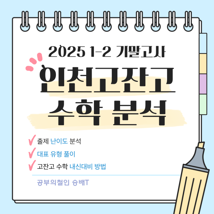 인천 고잔고 내신은 인천 내에서도 어려운 편에 속합니다. 수학도 마찬가지로 어렵습니다. 이번 기말고사 역시 평소처럼 어렵게 출제되었습니다. 킬러 문항 1개를 제외하면 극단적으로 어려웠던 문제는 없었습니다. 다만 중난이도 문제들도 오답이 나올 수 있는 문항들이 많아서 체계적으로 공부를 안 한 학생들은 오답이 대량 속출했을 것으로 예상합니다. 또 다수의 문항들이 풀이하는데 시간을 꽤 써야 했기 때문에 주어진 시간에 모든 문항을 풀기가 어려웠을 겁니다. 왜 그렇게 이야기할 수 있는지 시험 분석을 해보겠습니다. 시험범위 명제 ~ 유리함수와 무리함수 단원별 출제 난이도 분석 승배T 총평 난이도 하에 해당하는 문항이 너무 적....... <img src="https://blogthumb.pstatic.net/MjAyNjAyMjBfOTgg/MDAxNzcxNTYzNzQzMzEy.R4XYKEcYL3lbjD9NPthUhCv-kX8-WDmPfjn6Gz9R0EQg.lTVD-sgdYSvlZv4mqztN7YYX7tDv0qIQ5zRZBQVj54Mg.PNG/%C0%CE%C3%B5%B0%ED%C0%DC%B0%ED_%BC%F6%C7%D0%B1%E2%C3%E201.png?type=s3" />