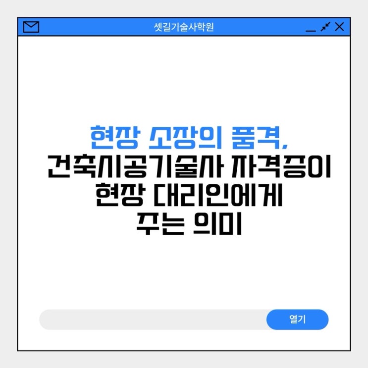 안녕하세요 셋길기술사학원입니다:) 건설 현장에서 '현장 대리인(현장 소장)'은 단순한 직책이 아닙니다. 발주자를 대신해 공사 전반을 총괄하고, 수백 명의 인력과 수백 억의 예산을 지휘하는 '현장의 사령관'이죠. 특히 건축시공기술사 자격증을 보유한 현장 대리인은 그 이름만으로도 현장에 남다른 신뢰와 무게감을 더합니다. 건설산업기본법에 따라 현장 대리인은 공사 규모에 맞춰 반드시 배치되어야 합니다. 기술사 자격증이 있고 없고의 차이는 여기서 극명하게 갈립니다. • 300억 원 이상 대형 공사: 기술사 또는 기능장급이 아니면 현장 대리인 선임 자체가 불가능한 경우가 많습니다. (특급기술자 경력 요건 충....... <img src="https://blogthumb.pstatic.net/MjAyNjAyMjBfMjY5/MDAxNzcxNTg5NzMwMzE0.mIHQpE4MWmeFMinagONjC6-cI6ccc1dcyZ-3sXCDW-gg.IIx6owE3xu0to0HvEQRQ0p2uUeh9xJP2jIrTfFalOjcg.JPEG/%C1%A6%B8%F1%C0%BB%A3%AD%C0%D4%B7%C2%C7%D8%C1%D6%BC%BC%BF%E4%A3%DF%A3%AD001%A3%A8278%A3%A9.jpg?type=s3" />