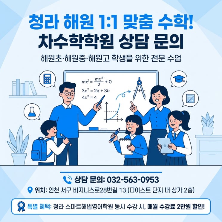 청라 해원초 학생들이 가장 먼저 잡아야 할 수학 기본 신학기가 시작되면 많은 학부모님들이 이런 고민을 하십니다. “우리 아이 수학 지금 괜찮을까요?” “학원은 다니고 있는데 실력이 늘고 있는지 모르겠어요.” 특히 청라 초등수학 상담을 하다 보면 아이들의 수학 실력을 좌우하는 공통적인 요소가 있습니다. 바로 ✔ 연산 기본기 ✔ 문제 이해력 ✔ 풀이 습관 이 3가지입니다. 실제로 해원초, 해원중, 해원고 학생들을 지도하다 보면 초등 시기에 이 기본이 잡혀 있는지에 따라 중학교, 고등학교 수학 실력이 크게 달라집니다. 1️⃣ 연산 속도와 정확도 초등수학의 가장 기본은 연산입니다. 덧셈, 뺄셈, 곱셈, 나눗셈이 자연스럽게 나오....... <img src="https://blogthumb.pstatic.net/MjAyNjAzMTZfMjIy/MDAxNzczNjY2OTA5Njk1.M7oe8xi3097tjngHoUKIShGT_UCTP2Yu9LM59DJsjXkg.boH7PjXUjYIj74wev-5bt56gHA_gaTRZ8Wce6VbnpSYg.JPEG/AIDrawing_260316_cb42f514-febe-4331-9990-b4d85c89af67_0_MiriCanvas.jpg?type=s3" />