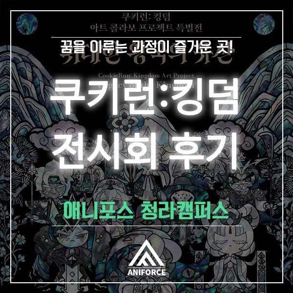 당신의 꿈을 이뤄 줄 만화학원 애니포스 청라캠퍼스 안녕하세요! 인천 #만화학원 의 중심 #애니포스 청라캠퍼스입니다! 서울 인사동에 위치한 아라아트센터에서 진행 중인 쿠키런 전시회에 다녀왔습니다. [쿠키런: 킹덤 아트 콜라보 프로젝트 - 위대한 왕국의 유산] <쿠키런 전시회 더 알아보기> - 기간: 26.01.23(금) - 26.05.17(일) - 장소: 아라아트센터 쿠키런 게임과 한국 전통 무형유산의 만남 이번 인사동 쿠키런 전시회는 단순한 캐릭터 전시를 넘어 전통 공예와 게임 콘텐츠가 결합된 색다른 형태의 전시였습니다. <쿠키런 킹덤 아트 프로젝트 영상> 출처: 데브시스터즈 대한민국을 대표하는 무형유산 장인 10인의 작품을 중....... <img src="https://blogthumb.pstatic.net/MjAyNjA0MTdfMTM2/MDAxNzc2NDE3MDQxNTQ4.d6joQKrBujMvdisU7X3sZjxNpZJO79z5s3tppFAjr1og.gIcB8Bsqk7Lrwt_uZUGQRnmxGmLEI6CTBA-i0Lzjz_Ag.JPEG/%BD%E6%B3%D7%C0%CF.jpg?type=s3" />