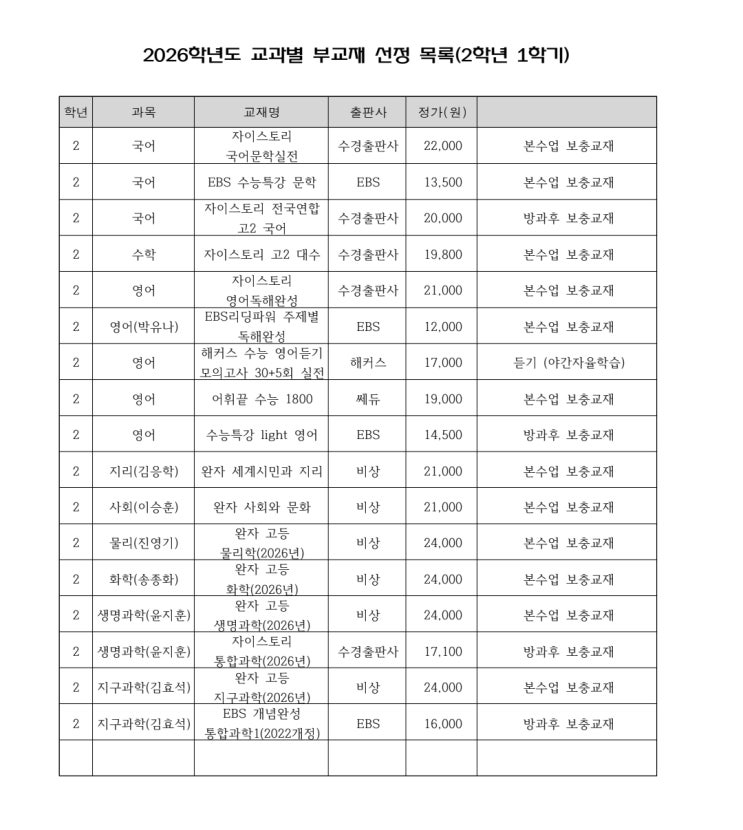 #2026년 서석고등학교 2학년 부교재
