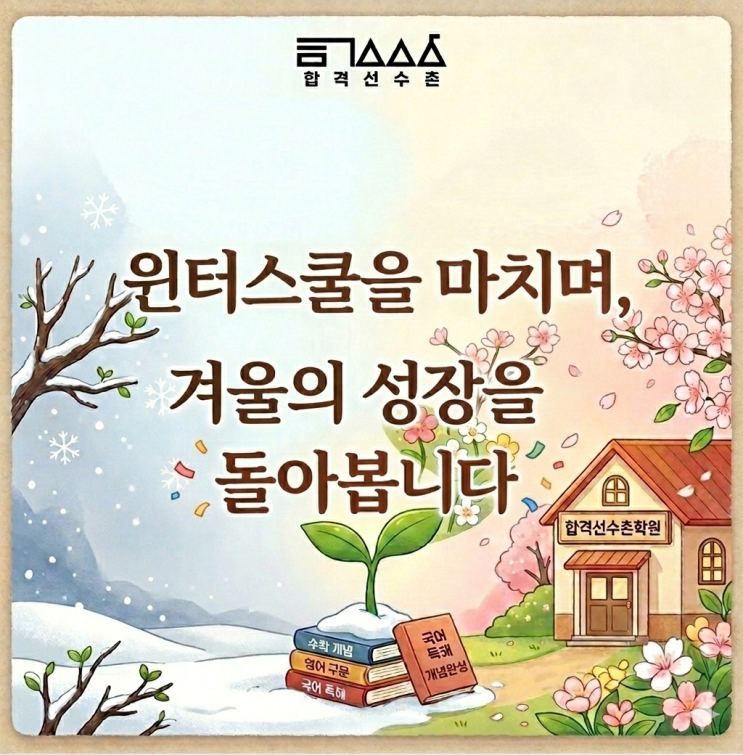 안녕하세요, 합격선수촌학원입니다. . . . 길고도 치열했던 윈터스쿨이 어느덧 마무리되었습니다. 매일 오전 9시부터 저녁 10시까지 이어진 이번 겨울은 학생들이 실력을 끌어올리고 공부 태도를 바꾸는 소중한 시간이었습니다. 방학이 막 시작되었을 때만 해도 긴 공부 시간을 버거워하거나 계획한 공부를 끝까지 밀고 가는 데 어려움을 느끼는 학생들이 적지 않았습니다. 하지만 하루하루 시간이 흐를수록 아이들은 눈에 띄게 달라졌습니다. 하루의 학습량을 감당하는 힘, 해야 할 공부를 미루지 않는 태도, 틀린 문제를 다시 확인하고 끝까지 해결하려는 습관까지. 스스로 부족한 부분을 마주하고 이겨내는 힘을 갖추게 되었습니다. 이번....... <img src="https://blogthumb.pstatic.net/MjAyNjAzMDFfMjI1/MDAxNzcyMzU2OTEwODA5.5aDCfZM_i7nRp1mscAgZ25IvVUi39qSh1wWq2_qCsRog.J4jFeiM7G-B5Vwg-r5LHc0a7ftPOBExUb_DfKhsMYzwg.PNG/Gemini_Generated_Image_yq9nd7yq9nd7yq9n.png?type=s3" />