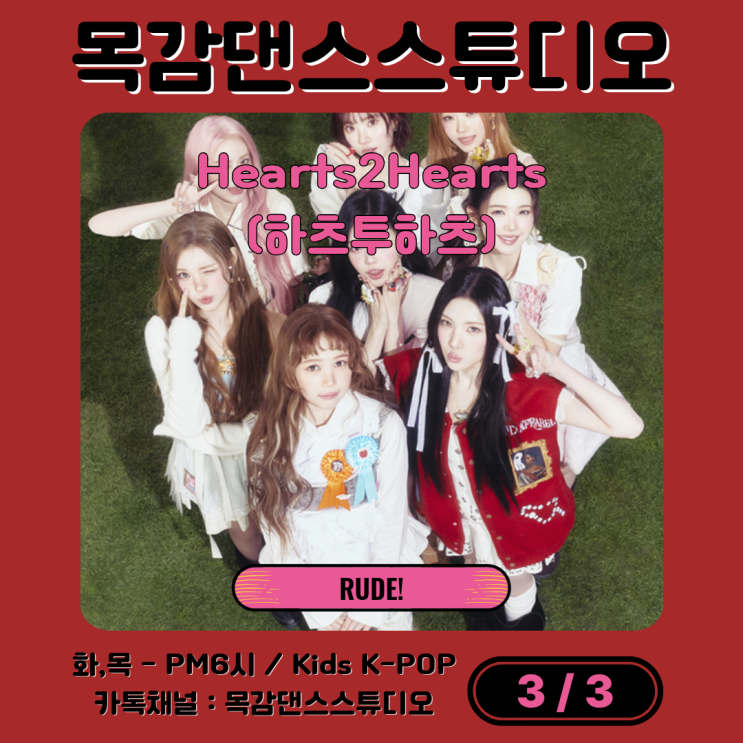 #목감댄스학원 #목감스텝박스수업 #시흥댄스학원 #시흥스텝박스수업 스트릿댄스 / 방송댄스 / 키즈반 / 스텝박스 / 필라테스 하츠투하츠 '루드' 새진도 시작✨ 안녕하세요, 목감댄스스튜디오입니다 화목 저녁 6시 키즈반에서 오늘부터 새로운 곡으로 진도가 시작되었습니다! 이번 곡은 하츠투하츠(Hearts2Hearts) - 루드(RUDE) 아이들이 좋아하는 밝은 분위기와 통통 튀는 동작이 매력적인 곡이에요 키즈반 수업은 이렇게 진행돼요 처음부터 음악에 바로 맞추지 않고 ✔ 동작 하나씩 천천히 설명 ✔ 반복 연습 ✔ 리듬감 익히기 ✔ 음악에 맞춰 연결 순서로 진행됩니다 아이들 눈높이에 맞춰 재미있게 배우는 것이....... <img src="https://blogthumb.pstatic.net/MjAyNjAzMDNfNTYg/MDAxNzcyNTM2MDk3ODkx.1tmhHX9oH02ilaOlaMnud9c8eNVL-7KZa7RQ91mjc-wg.h7OGTT0JdpK67jc9g9fpnLZ4qoZiBrNGc9wY0jVZYL8g.PNG/%C5%B0%C1%EE%B9%DD_%BB%F5%C1%F8%B5%B5.png?type=s3" />