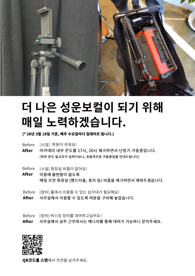 안녕하세요~! 성운보컬의 시설매니저 입니다!! #2026년 #3월 16일주에도 찾아온 #시설개선노트 입니다! 시설개선노트란? 성운보컬의 시설들(레슨실,연습실,화장실 등등..)을 이용하면서 고쳐줬으면 하는, 개선되었으면 하는 부분들을 적을 수 있는 소통창구 입니다! 시설개선노트의 장점! 첫 번째로, 언제,어디에서나 #QR코드 를 통해 손쉽게 #비대면 으로 시설에 대한 의견을 제출할수 있습니다! 두 번째, 제출된 의견은 바로 접수되어, 최대 1일 이내에 해결됩니다! 세 번째, 매주 갱신되는 개선노트를 통해 이번주 성운보컬에는 어떤 점들이 보수&개선 되었는지 한 눈에 볼 수있습니다! 와우,,, 너무 본격적인데? 아직 놀라긴 이릅니다!! ....... <img src="https://blogthumb.pstatic.net/MjAyNjAzMThfMjkx/MDAxNzczODIxODU0NzQ1.IOd65jxx1AIuNDeOYakiIT0y3Mp4fvyly6gplFdvVkQg.7S3L1pSAu7BluOgfGAzuk6s2OgmIiyg8hXDSMH_6xfwg.PNG/KakaoTalk_20260318_171506447.png?type=s3" />
