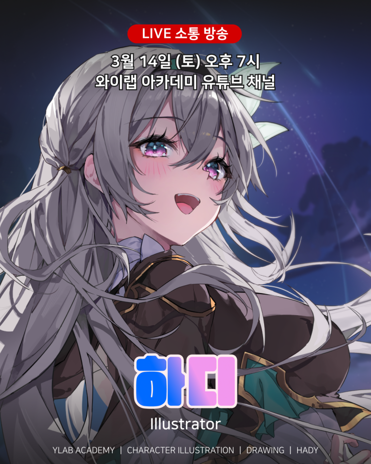 소통 방송 안내 캐릭터 일러스트 기초 수업을 진행하시는 하디 작가님과 함께하는 그림 소통방송! 나만의 개성을 담아 완성하는 캐릭터 일러스트! 하디작가님의 소통방송에서 만날 수 있습니다! 일시 : 2026. 3. 14 (토) 7시 유튜브 채널 링크 커리큘럼 자세히 보기 질문이 있다면 실시간 방송에서 편하게 물어보세요️ <img src="https://blogthumb.pstatic.net/MjAyNjAzMDVfMjI4/MDAxNzcyNzE3Njg4MDcz.F3F472FTWugVBF_7N8AIn09ssVrQmr7_sA-9K4hrhAwg.6auRV1pqSEUkNfxMT1TF9YGtZpFEDw7mt3X14iyR8Owg.PNG/%C7%CF%B5%F0_%BC%D2%C5%EB%B9%E6%BC%DB_SNS.png?type=s3" />