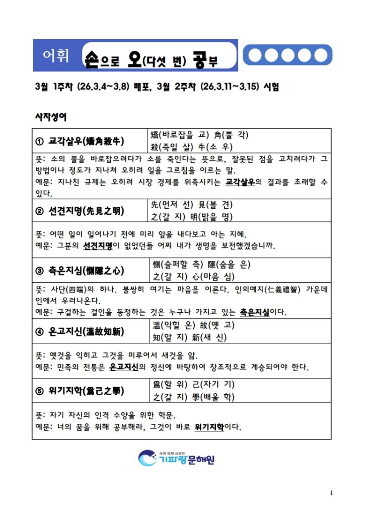 혹시, 떠먹여주는 공부를 하고 있지는 않나요? 점수를 잠깐 올려주는 공부는 결국 아이를 ‘평균 이하’로 머물게 만듭니다. 시험에 나올 문제만 골라 주고, 학원에서 차려주는 밥상만 받아먹는 공부. 처음엔 성적이 오를 수 있습니다. 문제풀이식 수업은 즉효가 있으니까요. . . 하지만 문제는 그다음입니다. 시험이 끝나면 전부 잊어버리고, 스스로 공부하는 힘은 자라지 않고, 또다시 누군가의 ‘잘 차려진 밥상’을 기다리는 아이. 이게 바로 떠먹여주는 공부의 가장 흔한 후유증입니다. 시행착오 없이 실력은 절대 자라지 않습니다. 공부는 결국 아이 스스로 부딪히고, 깨져봐야 비로소 실력이 됩니다. ✔ 많이 틀려보고, ✔ 많이 고민해 보....... <img src="https://blogthumb.pstatic.net/MjAyNjAzMDJfMjcx/MDAxNzcyNDQzMzUwNDQ4.-bQ0KzF-z2_3aRdE1qIGn2QpHaq66wNR7NgICOYkEI4g.3LfNOxFiewRRhQaFkmFO16-MA6NwuHtJWLlScd333j8g.JPEG/%BA%ED%B7%CE%B1%D7-%B4%EB%C7%A5%C0%CC%B9%CC%C1%F62-001_%281%29.jpg?type=s3" />