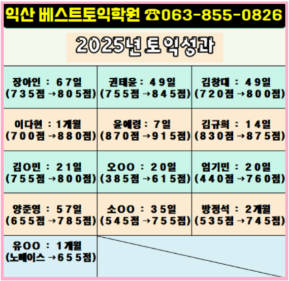 [익산토익학원] 베스트토익 2018년 8월 ~ 2026년 1월 점수결과 모음집 & 문장 구조 분석 베스트토익은 개강전 무료과외 및 무료기출단어학습, 탄탄하고 꼼꼼한 정규수업, 원장지도첨삭 그룹스터디, 무료특강, 녹화본영상 등 독보적인 커리큘럼으로 익산 넘버원으로 점수결과를 만들고 있는 익산토익학원입니다. 지난 포스팅에서 조성우 학생의 18일만에 600 → 815로 수직 상승한 스토리를 전해드렸습니다. 자세히 보러가기 ▼▼ https://blog.naver.com/best-toeic/224201792261 3월 봄학기 개강일은 3월 16일(월)이며, 사전 등록한 모든 분들께 무료기출단어학습 및 무료과외 등 선행학습을 이행해 드리고 있습니다. 철저하게 계획하고 준....... <img src="https://blogthumb.pstatic.net/MjAyNjAzMDlfMjA4/MDAxNzczMDU4MzgxNTI3.9SubHJ8M5ps1AXZt2TpnqiH3sFa6-sV7-NSU5tGAjR8g.Xh6pjtHypeHMuKJqLIXIj8aaRNaWv50LjaQbVKCHoRwg.PNG/q.png?type=s3" />
