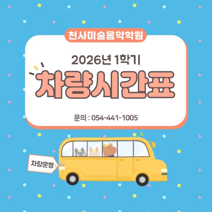 안녕하세요 ʚ천사미술음악학원입니다ɞ 저희 학원은 아이들이 학원에 안전하게 오고 갈 수 있도록 원호 일대 차량운행 하고 있습니다 현재 학원 차량은 정해진 시간표에 따라 운행되고 있습니다. 다만, 원하시는 시간이 시간표에 없을 경우 조율이 가능한지 문의 주시면 최대한 반영해드릴 수 있도록 노력하겠습니다✨ 궁금한 점이 있으시면 언제든지 편하게 연락 주세요! 운영시간 - p.m. 12:30-18:00 문의 - 054.441.1005 <img src="https://blogthumb.pstatic.net/MjAyNjAzMDFfMzEg/MDAxNzcyMzY5MDI2NDYy.wbl4x8KJp4YBf89_MRRV-ADFT8ksrGsVkyoQjf2L8IQg.-ZljFCEg5vbEAKRmkN4BCuHjz3jIqs2UCdbFLw8pj4Eg.JPEG/%C1%A6%B8%F1%C0%BB%A3%AD%C0%D4%B7%C2%C7%D8%C1%D6%BC%BC%BF%E4%A3%DF%A3%AD001%A3%A834%A3%A9.jpg?type=s3" />