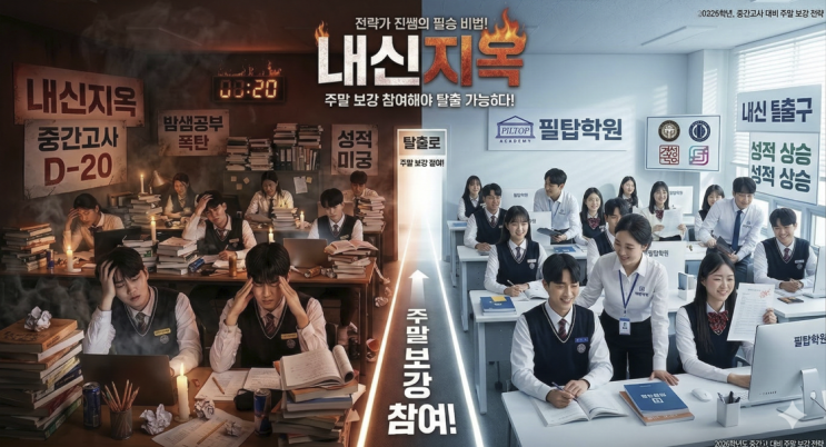 주말인데... 또 학원 가야 해요? 라고 말하던 아이가, 시험 끝나고는 이렇게 말합니다. 주말 보강 안 했으면 큰일 날 뻔했어요. 안녕하세요. 경산 사동 중등 국어/영어/수학/과학 내신전문 필탑학원 전략가 진쌤입니다. 새학기에 어느 정도 적응이 되었다 싶으면 어김없이 찾아오는 것이 있습니다. 바로 중간고사입니다. 그리고 이 시기, 아이들의 성적을 결정짓는 가장 중요한 포인트는 단 하나입니다. “얼마나 미리, 얼마나 제대로 준비했는가” 그래서 준비했습니다. 필탑학원 중등 내신 대비 ‘주말 보강’ 주중 수업만으로는 부족할 수 있는 ✔ 개념 점검 ✔ 학교별 시험 범위 정리 ✔ 문제풀이 훈련 ✔ 오답 보완 이 모든 과정을 한....... <img src="https://blogthumb.pstatic.net/MjAyNjAzMThfMTQ1/MDAxNzczODE4OTY1Mjc0.Kv9xMVGOv3QvtQAU0Tyqqbp4tqqLdnbNesXV-8c44wMg.wQKdJ6Qiv6OND1U0927dDdRD4u3R0QWEuF8TpOV4LOQg.PNG/image.png?type=s3" />