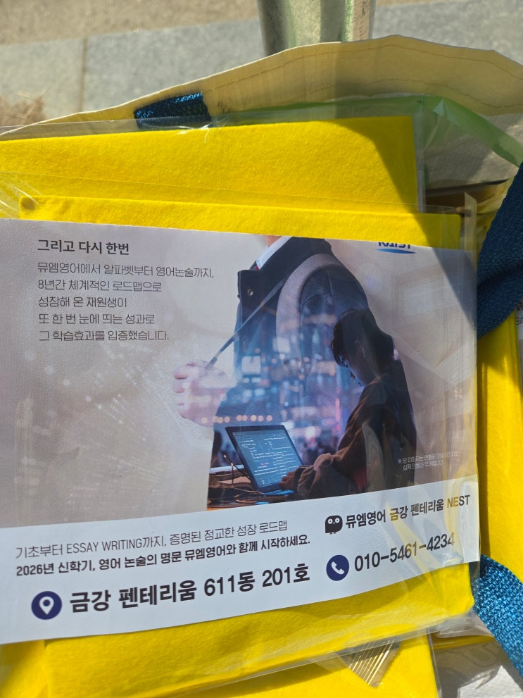 3월 신학기, 뮤엠영어의 노~란 물결로 물들었던 홍보 현장 ! 혹시 등굣길에 노란 봉투를 받아보신 적 있으신가요? 아파트 단지 앞이나 학교 정문 근처에서 뭔가 분주하게 나눠주던 분들을 보셨다면, 바로 저희 홍보 현장이었을 거예요. 3월 신학기를 맞아 전국 곳곳에서 뮤엠영어와 뮤엠폴리오 홍보가 동시에 펼쳐졌는데요, "직접 찾아가서 만나는 것"이 저희가 항상 고수하는 방식입니다. 온라인 광고 한 장보다 실제 현장에서 직접 건네는 홍보물 한 장이 훨씬 많은 이야기를 담을 수 있다고 생각하기 때문입니다. 이미 현장에서 받아가신 분들도 계시겠지만, 미처 보지 못하신 분들을 위해 오늘은 그 생생한 현장을 처음부터 끝까지....... <img src="https://blogthumb.pstatic.net/MjAyNjAzMTdfNyAg/MDAxNzczNzIwNDU3Njk0.LUu6lvo562CC1sKpIOn6Ow5vwEiTrUn415Ou_hm6VAsg.kCNMhwCLTl-q1qvXMfDeliOnuO8aS6rylBBAl-78Qcgg.JPEG/%BC%F6%B5%B51%C1%F6%BB%E7_%B1%DD%B0%AD%C6%E6%C5%D7%B8%AE%BF%F2nest_%281%29.jpg?type=s3" />