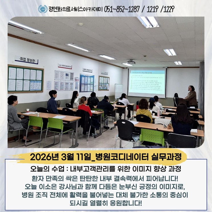 안녕하세요! 정연화 의료서비스 아카데미 입니다! 봄기운이 완연한 3월 11일 수요일, 우리 병원코디네이터 실무과정 수강생들은 환자가 아닌 '내부 고객(동료)'을 향해 시선을 돌렸습니다. 조직의 결속력을 다지고 나의 프로페셔널한 가치를 한층 높여준 이소은 강사님의 매력적인 수업 현장을 소개합니다. ▶ 내부고객관리를 위한 이미지 향상과정 (이소은 강사님 직강) 오늘의 핵심 주제는 이소은 강사님과 함께한 '내부고객관리와 이미지 향상'이었습니다. 흔히 CS라고 하면 병원 문을 열고 들어오는 환자만을 떠올리기 쉽습니다. 하지만 원장님, 간호사, 방사선사 등 함께 일하는 원내 모든 직원이 바로 가장 중요한 &#x....... <img src="https://blogthumb.pstatic.net/MjAyNjAzMTJfMTg2/MDAxNzczMzEzMzMwMjQ5.5frJmC4ancNw6bPJoBIsvkzWNK6ORpufMhX0m0jiLUYg.0mDZCL0GoefyFxDy-VkW5-wABSTYGBWFREK-SLyD3Hsg.JPEG/0311.jpg?type=s3" />