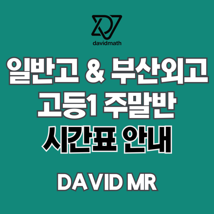 2026년 다비드수학 고등부 3월 주말반 다비드수학 명륜 학교 야간자율학습으로 평일 학원 수업 참여가 어려운 학생들을 위해 주말반을 개설하였습니다. 용인고와 대명여고에서 평일 야간자율학습을 신청한 학생들은 주말반으로 배정되었습니다. 부산외고는 주말수업으로 진행하며 학교 내신 대비를 위한 맞춤 수업을 진행합니다. 일반고와 함께 부산외고 역시 고쟁이 교재를 활용한 실전 문제 풀이 중심으로 수업합니다. 내신 고득점을 목표로 하는 학생들의 많은 문의 바랍니다. <img src="https://blogthumb.pstatic.net/MjAyNjAzMDJfMTI1/MDAxNzcyNDAxMTY5MTg3.KGoZ2Xedzq6Kpoeo1cHskEVOCbNGrYvucpyA-L99c38g.3Lycpy3vA7YkMUhHfqh1Cyn_sqiJ35VC3uOmv8FfZGwg.PNG/%C1%A6%B8%F1%C0%BB-%C0%D4%B7%C2%C7%D8%C1%D6%BC%BC%BF%E4__%BA%B9%BB%E7%BA%BB-_13_-001_%283%29.png?type=s3" />