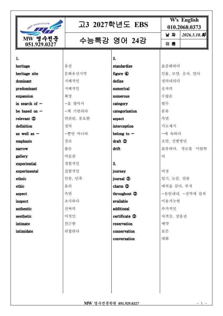 부산 동래구 명륜동 영어 엠더블유MW영수전문학원입니다. 2026년 3월, 고3 학생들을 위한 2027학년도 EBS 수능특강 영어 24,25,26,27,28강 필수단어입니다. MW 051 929 0327 영어 010 2068 0373 수학 010 4726 2678 *강의중이라 통화가 어려운 경우 문자주시면 연락드립니다. #명륜동영어 #명륜동수학 #동래고영어 #용인고영어 #사대부고영어 #내성고영어 #중앙여고영어 #대명여고영어 #이사벨고영어 #사직고영어 #지산고영어 #유락여중영어 #동해중영어 #동래중영어 #부곡여중영어 #부곡중영어 <img src="https://blogthumb.pstatic.net/MjAyNjAzMTNfMjMy/MDAxNzczMzQwMjgxNzMw.wwUov0LoipuhSYL7OttBYp6qFSV_caxNDJn1Smr6haEg.smKvoGhOH0F0RyNmzcqmFC4aKeyfeuIFcxEjaIk4UNkg.JPEG/2027%C7%D0%B3%E2%B5%B5_EBS_%BC%F6%B4%C9%C6%AF%B0%AD_%BF%B5%BE%EE_24%B0%AD_%B4%DC%BE%EE_1.jpg?type=s3" />