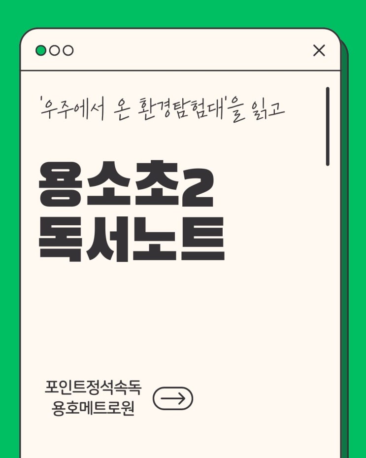 용소초2 독서노트 피드백 《우주에서 온 환경탐험대》를 읽고 독서노트를 작성해 주었군요. 우주인 넬라와 실키는 우주의 어른들 몰래 지구에 왔다가 그만 별 조각 하나를 잃어버려요. 별 조각을 주운 재우를 지켜보던 둘은 별 조각을 돌려받기 위해 재우를 따라 쿨하리 마을로 갑니다. 그곳에서 만난 은비에게 재우가 별 조각을 선물하려고 하자, 넬라와 실키는 별 조각을 돌려받는 조건으로 우주를 구경시켜 줄 것을 약속하고, 은비의 소개를 받아 지구의 환경을 살펴봅니다. 환경이 오염되면 기후에 변화가 생겨요. 갑자기 비가 많이 와 홍수가 나고, 갑자기 날씨가 더워지는 폭염이 찾아오지요. 기후 변화로 생태계가 무너져 식물과 생물이 죽....... <img src="https://blogthumb.pstatic.net/MjAyNjAzMDZfMTg5/MDAxNzcyNzg5ODkyMjEz.riRgCaC07TB8gUFxudaPhvGSIZdZfL_p0dtjHWbL6T4g.EnBqTtz7loMNh9nDc_6fTdb5XEvdEpZ8DSYLVMA11rQg.JPEG/%3F%3F%3F%82%A8%EC%B4%3F_%281%29.jpg?type=s3" />