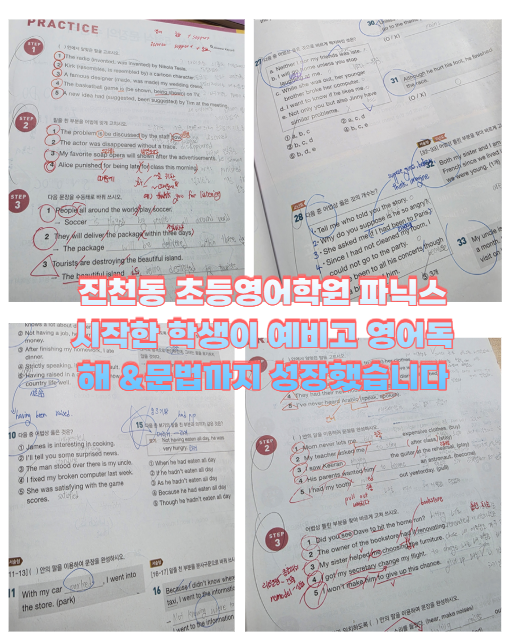 진천동 영어학원 아이스터디영어학원입니다. 오늘은 우리 학원에서 초등2학년말 파닉스기초 영어의 첫시작부터 아이스터디영어학원에서 시작해 현재 중3 (예비고 단계 학습중)인 학생의 영문법 공부에 대해 말씀드리려고합니다. 이 학생은 초2 때 영어 파닉스, 알파벳부터 시작했습니다. 처음에는 알파벳쓰기, 음가, 단모음, 장모음, 이중소리, 스토리북, 단어에서 문장 읽기부터 차근차근 시작했습니다. 파닉스 → 기초리딩 → 기초쓰기&말하기→영어독해 → 영어문법 → 서술형쓰기&말하기→단어 → 듣기 이렇게 영역별로 학생 수준에 맞는 초등 영어학습 커리큘럼으로 공부를 시작했습니다. 처음부터 무리하게 어려운 수업을 하는 것....... <img src="https://blogthumb.pstatic.net/MjAyNjAzMTFfMjcy/MDAxNzczMjI5MzIwOTgy.fMyBmP2BVi0gJoapiyXPLNFRyoGoQ1fc5Q5tMgrtzaEg.Uc2_DxbV3BMiVJtQWKo0GwFnGWtXx-2Zt0BH6we11aAg.PNG/image.png?type=s3" />