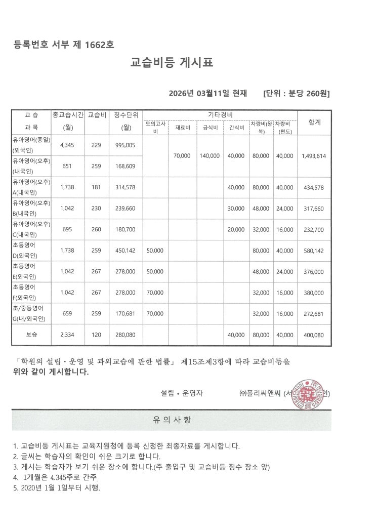 「학원의 설립․운영 및 과외교습에 관한 법률」 제15조 제3항 에 의거해 교습비를 게시합니다. 학원 명칭: 청라폴리어학원 <img src="https://blogthumb.pstatic.net/MjAyNjAzMTJfODIg/MDAxNzczMjc5NzMwMTMx.uHY7g9nj17tEZkZad-hqYjVfv-sFwUCIqb-HYgwYUyUg.0kzRV8_YjWAOW9e5K4j28SA1hEBLA6bfSbL1L13zXtAg.JPEG/KakaoTalk_20260312_100017768.jpg?type=s3" />