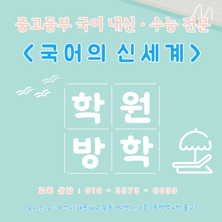 반갑습니다^-^!! 부산 해운대구 우동, 동백역 4번 출구에 위치한 <국어의 신세계> 원장 신세영입니다. 학원 겨울 방학 기간 ㅡ 신규 상담은 [학생의 학교와 학년]을 문자로 남겨주시면, 연락 주신 순서대로 다시 연락드리겠습니다 ^-^ 가족들과 행복하고 즐거운 추억 많이 만들고 다음 시간에 만나요 ^-^!! 제대로 된 수업으로, 책임지고 가르치겠습니다. 감사합니다! 교육 상담 : 010 - 3573 - 6039 ( 전화를 받지 못한 경우, 연락 주신 순서대로 제가 다시 연락드리겠습니다 ^-^ ) 오시는 길 - 지번 주소 : 부산광역시 해운대구 우동 951번지, 2층 (동백역 4번 출구) - 도로명 주소 : 부산광역시 해운대구 해운대로483번길 8, 2층 (동백....... <img src="https://blogthumb.pstatic.net/MjAyNjAxMjVfMTI4/MDAxNzY5MzEwMjc4OTkw.k7FGGl63AObDeM8SjbqurW5JbjgrS-OdP3Ko9DTeCuog.F1pASElt5Z3dvNUInfxuK2J6lrBaQK5EaS-4GC3VA8gg.JPEG/%C7%D0%BF%F8%B9%E6%C7%D0_%BD%E6%B3%D7%C0%CF.jpg?type=s3" />