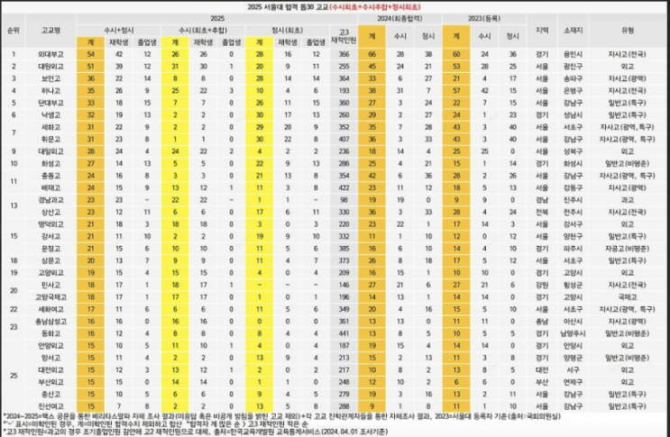 [2025 서울대 합격(수시+정시) Top 5] 1위 외대부고: 54명 (수시 26 + 정시 28) 2위 대원외고: 51명 (수시 39 + 정시 12) 3위 보인고: 36명 (수시 22 + 정시 14) 4️⃣ 4위 하나고: 35명 5️⃣ 5위 단대부고: 33명 특히 3위에 오른 **'보인고(송파 자사고)'**의 약진이 눈에 띕니다. 강남구가 아님에도 쟁쟁한 학교들을 제치고 Top 3에 진입했죠. 어머님, 이 학교들이 서울대를 많이 보내는 '진짜 이유'가 무엇일까요? 단순히 아이들이 똑똑해서일까요? 저는 **'시스템의 차이'**라고 확신합니다. Top 5 학교들의 공통점은 학생을 그냥 방치하지 않는다는 점입니다. ①치열한 경쟁 환경(전국 단위....... <img src="https://blogthumb.pstatic.net/MjAyNjAxMjZfMTUz/MDAxNzY5NDIyODg3MDU0.s885BbyI6CG4Q3F43hznE22SMDFNygMnCUddgAgUP5Mg.F9fXEWauZIAibYQ6lJ0T9as7cfEYNQ2cyqjwwcNOYUAg.PNG/%A4%B5%BC%AD%BF%EF%B4%EB%C0%D4%B0%E1%BC%F8%C0%A7.png?type=s3" />