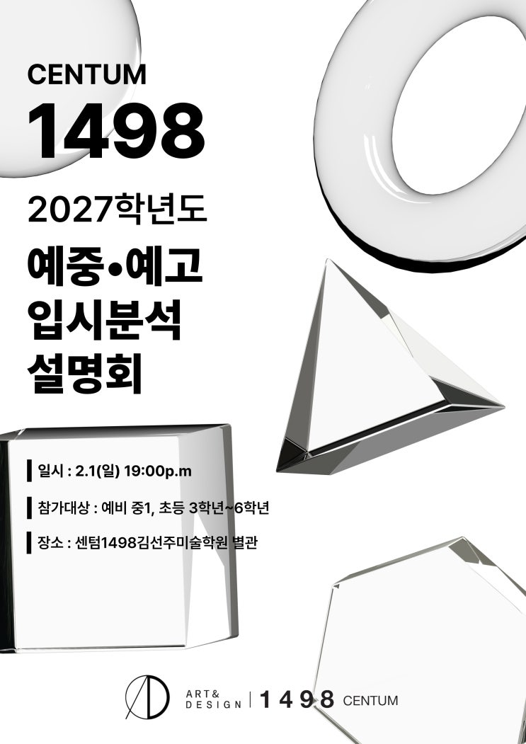 안녕하세요! 센텀1498김선주미술학원입니다! 새로운 한 해의 시작과 함께 센텀1498김선주미술학원에서도 2027학년도 예중•예고 입시분석설명회를 준비했습니다. 이번 설명회는 현재 중학교 1학년, 초등 고학년 예고 준비를 앞두고 있는 초중생과 학부모님을 대상으로 진행합니다. 입시는 학생 혼자만의 노력으로 완성되기보다, 곁에서 방향을 잡아주고 응원해 주는 학부모님의 이해와 관심이 더해질 때 비로소 올바른 길로 나아갈 수 있습니다. '열심히'보다 중요한 것' 입시에서 더 중요한 것은 '얼마나 열심히'보다 '어떻게' 제대로 준비해야 하는지입니다. "2027학년도 센텀1498김선주미술학원 예중....... <img src="https://blogthumb.pstatic.net/MjAyNjAxMjdfMTgz/MDAxNzY5NDk5ODc1MzM2.DWXT7RbQjbogEnI46ScgkQW_MNXjaIp8UGmU9JiJ1Wog.3yDSvuGU0-Gzru_T84zBMY4KUxpjqLZ1OBuO1fKmeEkg.JPEG/%C1%A6%B8%F1%C0%BB-%C0%D4%B7%C2%C7%D8%C1%D6%BC%BC%BF%E4_-001_%2836%29.jpg?type=s3" />