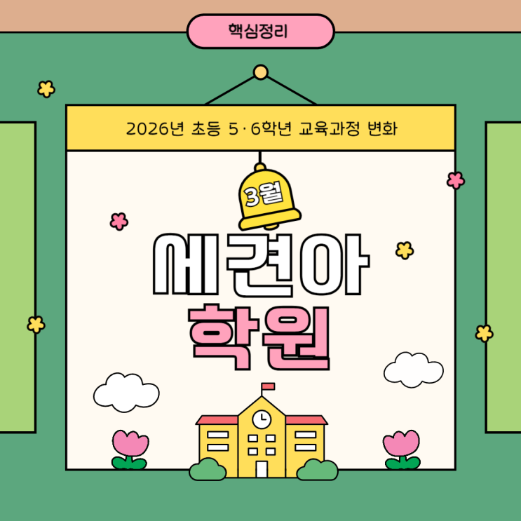 안녕하세요. 학생들의 학습 습관과 기초 실력을 중요하게 생각하는 세견아학원입니다. 2026년 3월부터 초등학교 5·6학년 교육과정이 새롭게 적용됩니다. 학부모님들께서 “우리 아이 수업이 많이 달라지나요?” “미리 준비해야 할 게 있을까요?” 이런 질문을 많이 하셔서 핵심 변화만 간단하게 정리해 드립니다. 2026 초등 교육과정 핵심 변화 4가지 이번 교육과정 변화는 크게 4가지 핵심 방향으로 볼 수 있습니다. ✔ 정보 교과 신설 ✔ 수학 학습 방식 변화 ✔ 사회·역사 수업 변화 ✔ 실과 과목 내용 변화 하나씩 살펴보겠습니다. 정보 교과 신설 AI·코딩이 정식 과목이 됩니다 기존에는 실과 시간에 컴퓨터를 간단히 배우는 수준이었....... <img src="https://blogthumb.pstatic.net/MjAyNjAzMDlfMTU3/MDAxNzczMDM3OTAxNjYy.Ebx279b_nRdnhijJ8xIrTHz1OUlA3_YZMzm3qnkwBfAg.4l7TqOGYYHnOH9DTLgbM59VsXeQM8dz9STGJffky6Icg.PNG/%BC%D2%BF%B5_%C5%DB%C7%C3%B8%B4_2-017_%284%29.png?type=s3" />